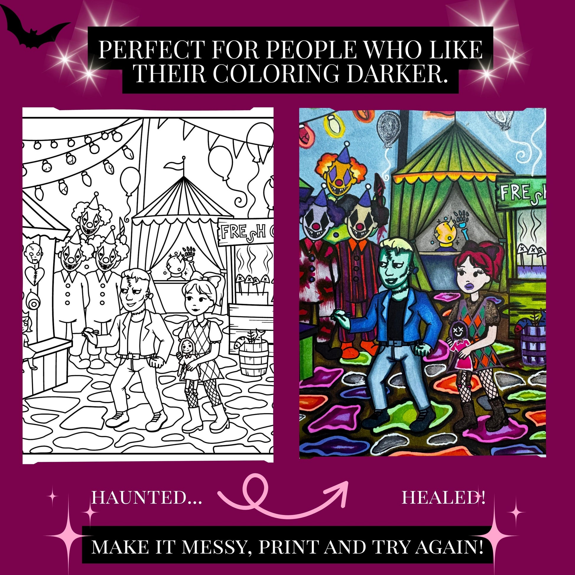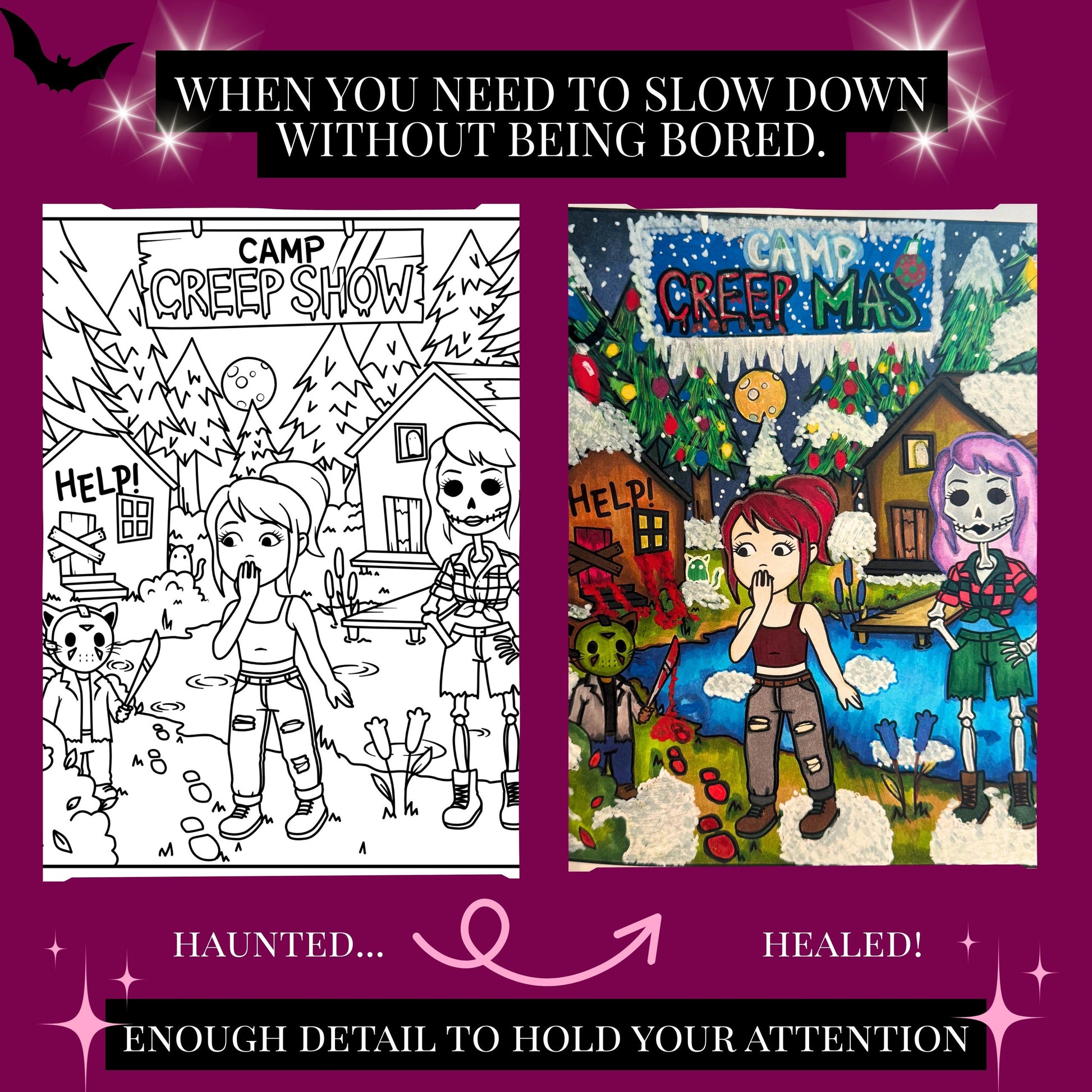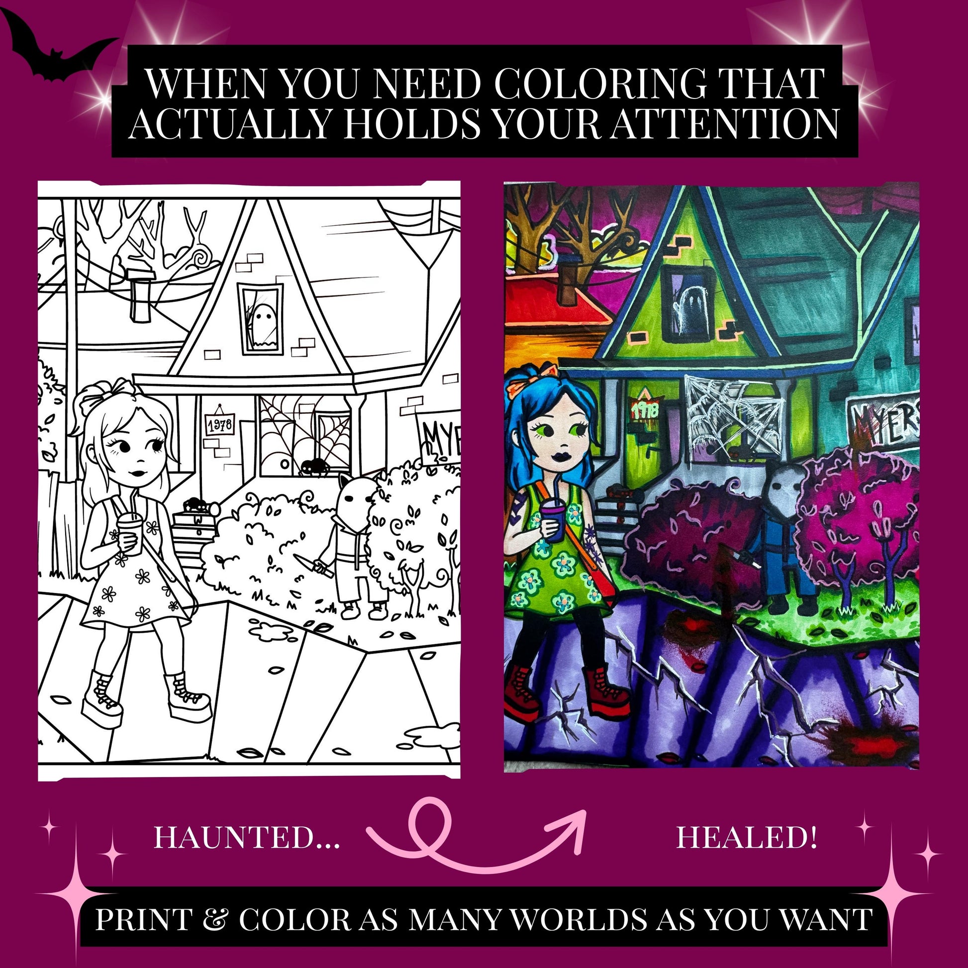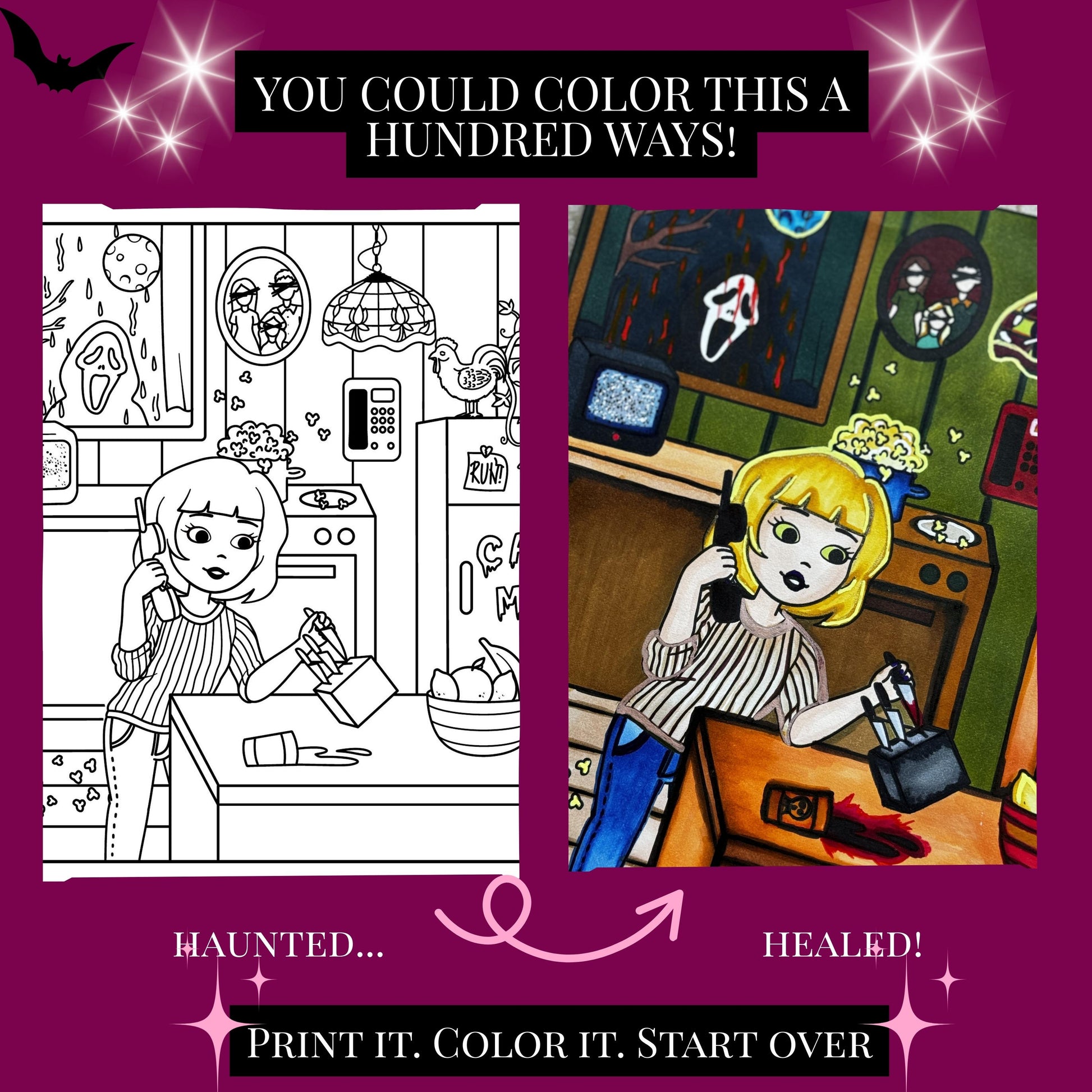 The Killer Mini Pack is a digital coloring pack featuring four original killer-inspired scenes. Each page leans darker, cinematic, and a little unsettling — designed for brains who like their coloring engaging with the perfect amount of detail!